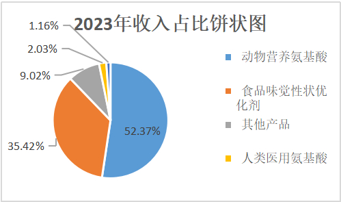 根据梅花生物2023年年报数据:动物营养氨基酸收入145.39亿元,收入占比52.37%;食品味觉性状优化剂收入98.32亿元,收入占比35.42%;其他产品收入25.04亿元,收入占比9.02%;人类医用氨基酸收入5.63亿元,收入占比2.03%;其他业务收入3.22亿元,收入占比1.16%。2023年按照行业分类:生物发酵行业收入268.76亿元,收入占比96.81%;医药健康行业收入5.63亿元,收入占比2.03%;其他业务收入3.22亿元,收入占比1.16%。2023年国内收入192.89亿元,收入占比69.48%,国外收入84.72亿元,收入占比30.52%。