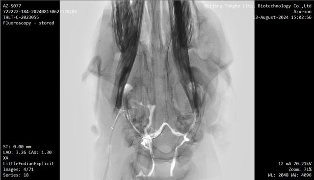 本次试验是在前期两项试验基础上取得的进一步成果,内容包括将无线传输设备植入实验动物皮下,并将采集到的介入式脑电信号通过无线传输设备传出,实现了稳定、高效的信号传输;以及通过介入手术将先前导入羊颅内血管壁上的介入式脑机接口传感器安全取出,整个过程在DSA造影引导下进行,确保了手术过程的安全性。