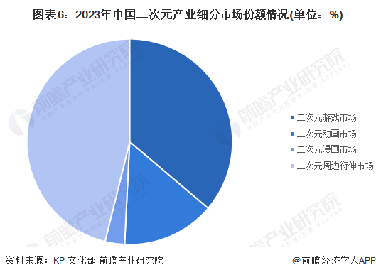 二次元产业市场包括二次元内容市场和二次元周边衍生市场,其中二次元内容市场又包括游戏、动画和漫画。2023年,二次元产业中内容市场所占市场份额达到53.9%,其中二次元游戏市场份额达到36.2%,是二次元产业目前最重要的细分市场。