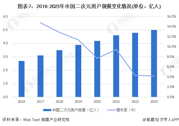 2016-2023年,得益于国内外优质动漫作品尤其是国产原创动画的涌现,《明日方舟》、《原神》等优质二次元手游的集中上线,中国二次元用户规模呈逐年增长趋势。2023年,中国泛二次元用户规模突破5亿人。