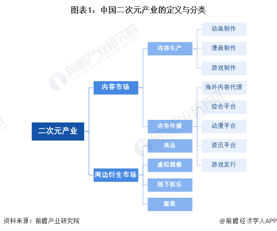据此,中国的二次元产业主要是指围绕着ACG(包括二次元漫画、二次元动画和二次元游戏)生成的产业集群,具体包括二次元内容市场和二次元周边衍生市场。其中,二次元内容市场包括内容生产和内容传播,内容生产又包括动画制作、漫画制作(也将动画制作、漫画制作统称为动漫制作)、游戏制作;二次元周边衍生市场包括二次元商品(ACG周边、手办、潮玩、手帐胶带、卡牌等)、二次元虚拟偶像、二次元线下娱乐、二次元服装。