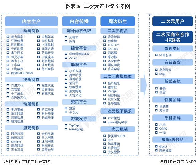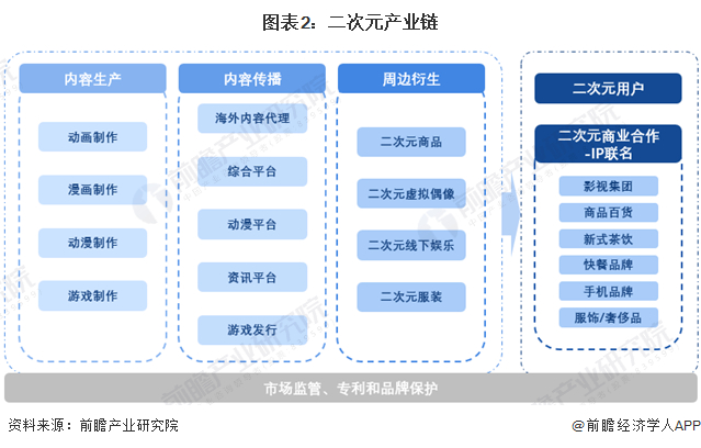 中国二次元产业链包括内容生产、内容传播和周边衍生三部分,其中,内容生产包括动画制作、漫画制作、游戏制作;内容传播包括海外内容代理、综合平台、动漫平台、资讯平台、游戏发行;周边衍生包括二次元商品(ACG周边、手办、潮玩、手帐胶带、卡牌等)、二次元虚拟偶像、二次元线下娱乐、二次元服装等。二次元产业链的受众群体主要包括二次元用户和二次元商业合作,其中二次元商业合作主要指IP联名合作。