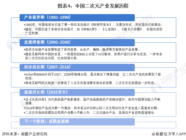 中国二次元产业发展可以追溯到改革开放的年代,1980年开始,中国电视台引进一批国外优秀的动画,同时长江三角和珠江三角成为了重要的全球动画加工基地;2000年开始,中国颁布了一系列扶持本土动漫的政策,中国二次元产业进入发展探索期;2007年以后,随着AcFun和Bilibili的相继出现,以及2010年之后移动上网设备的逐步普及,二次元产业正式进入初步成长期;2015年,以《大圣归来》、《大鱼海棠》等国产动画电影为代表,本土二次元内容生产不断发力,且二次元会展、演出等新兴产业涌现,二次元产业在中国迎来高速成长期,在今天不断朝成熟发展阶段靠拢。