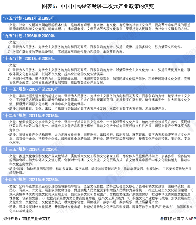 中国的二次元产业定义为围绕着ACG的,国内外文化相互融合发展形成的产业集群,属于中国文化产业下的分支。“八五”至“十五”时期,我国二次元产业的相关国民规划主要围绕“加强社会主义精神文明建设”进行,为二次元文化在中国的发展奠定基础,其中,“十五”规划提出要“吸收外国文化有益成果”。“十一五”时期,规划首次提出“发展动漫产业”;“十二五”时期,规划提出推进文化产业结构调整,大力发展动漫等重点文化产业;“十三五”时期,规划提出要“推动中华文化走向世界”、“加快发展动漫游戏等新兴产业”;“十四五”时期,规划提出鼓励影视剧、游戏等数字文化产品走出去,加强国家文化出口基地建设。至此,中国二次元产业相的关国家政策实现了文化基础建设、文化引进、文化融合发展、文化再输出的循环。