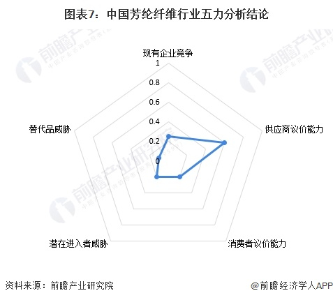 根据以上分析,对各方面的竞争情况进行量化,1代表最大,0代表最小,中国芳纶纤维行业的竞争情况如下图所示: