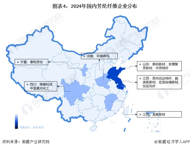从中国代表性芳纶纤维生产企业区域分布看,山东、江苏、四川等省市芳纶纤维生产企业较多,其中山东和江苏分别有3家代表性企业,如行业龙头公司泰和新材就位于山东省。宁夏、江西等省市也分布着一些芳纶纤维生产企业,如泰和新材下属公司泰和芳纶就位于宁夏。