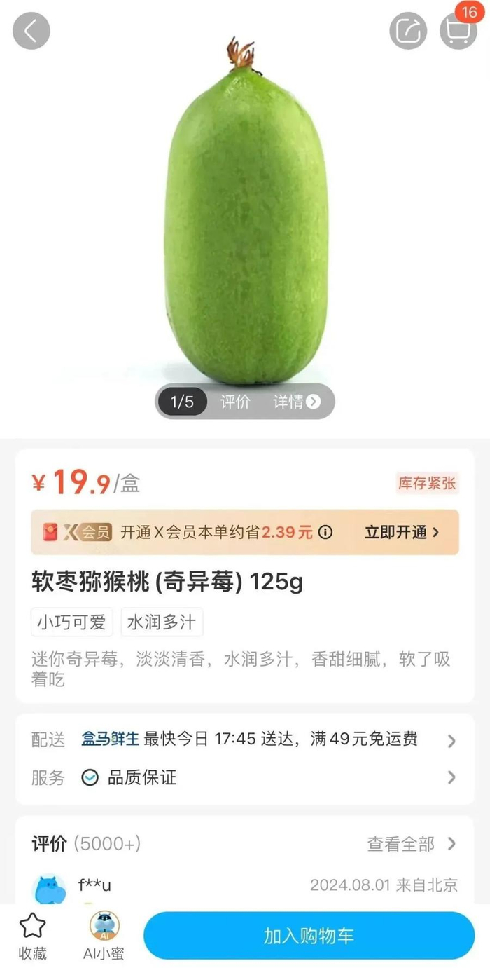 奇异果又叫软枣猕猴桃,摸起来软了口味更好,可以带皮吃也可以剥皮吃。盒马的奇异莓是小包装,更适合尝鲜,125克装19.9元。
