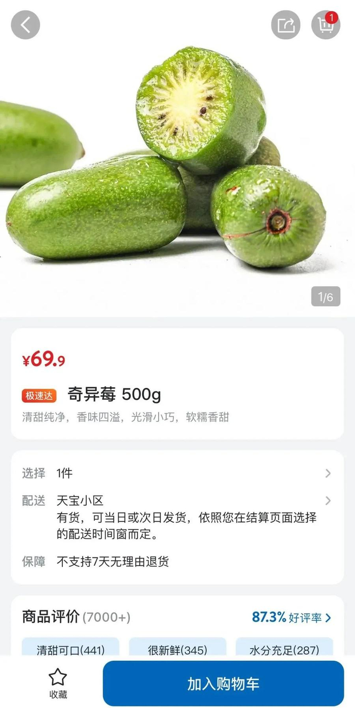 前几天山姆上架了奇异莓,有人第一时间下单买了一份,“去年吃过,软软糯糯,酸甜口的。”今年新上市的价格是69.9元一斤,历史销量未知,但是评价有7000+,好评率87.3%。