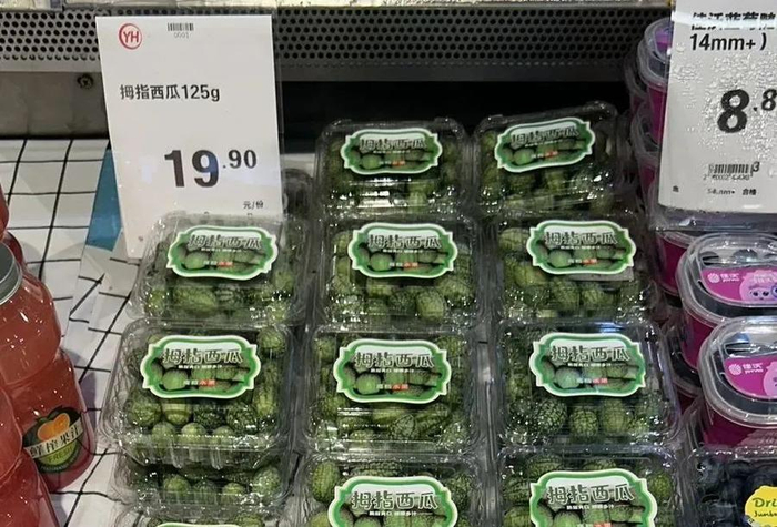 拇指西瓜,没吃过的人都好奇什么味道。街边水果店里几乎没见有卖,倒是大型商超会进些来试试水,满足一下消费者的好奇心。