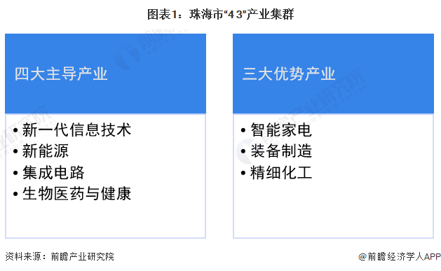 2022年4月,珠海市正式印发《关于坚持“产业第一” 加快推动工业经济高质量发展的实施方案》(以下简称方案),明确了“产业第一”的原则,把产业发展和园区建设作为经济发展主战场,努力打造 “4+3”产业集群。“4+3”产业集群是指新一代信息技术、新能源、集成电路、生物医药与健康4大主导产业,以及智能家电、装备制造、精细化工3大优势产业。