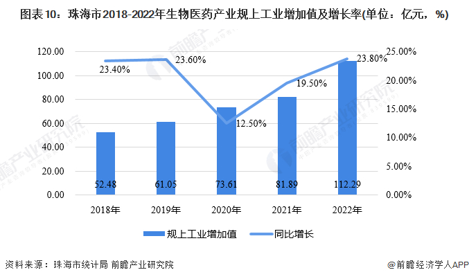 根据珠海市统计局官网公开数据显示:2018年珠海市生物医药产业累计完成规上工业增加值52.48亿元,同比增长23.4%;2019年累计完成规上工业增加值61.05亿元,同比增长23.6%;2020年累计完成规上工业增加值73.61亿元,同比增长12.5%;2021年累计完成规上工业增加值81.89亿元,同比增长19.5%;2022年累计完成规上工业增加值112.29亿元,同比增长23.8%。珠海市生物医药与健康产业近年发展迅速,2022年规上工业增加值已破百亿。