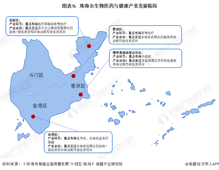 珠海市生物医药与健康产业规划布局根据《珠海市制造业高质量发展“十四五”规划》,生物医药与健康产业布局以金湾区为主导,以香洲区、高新区为辅助,同时增加横琴粤澳深度合作区的珠澳中医药合作特色园区。