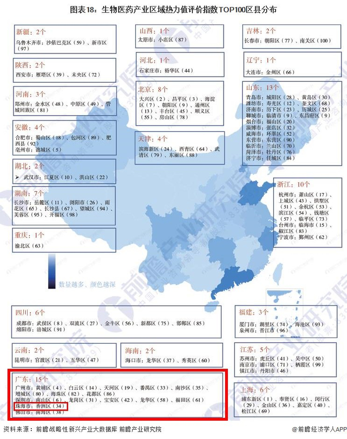 从生物医药产业战略性新兴产业区域热力值评价指数综合排名情况来看,广东省分别有15个区县进入前100,其中,珠海市香洲区排名第34位。