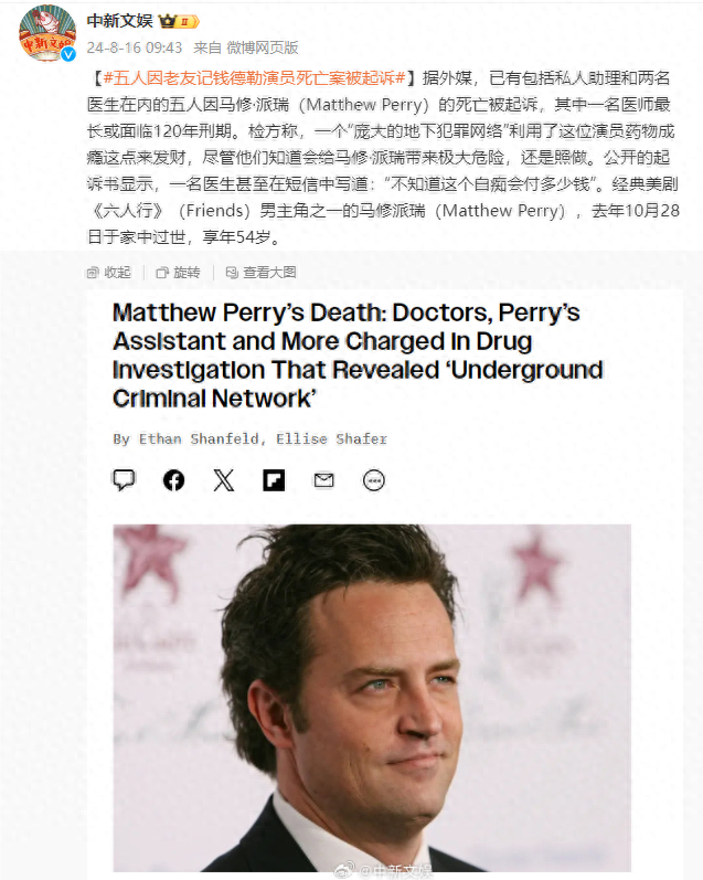 据外媒,已有包括私人助理和两名医生在内的五人因马修·派瑞(Matthew Perry)的死亡被起诉,其中一名医师最长或面临120年刑期。检方称,一个“庞大的地下犯罪网络”利用了这位演员药物成瘾这点来发财,尽管他们知道会给马修·派瑞带来极大危险,还是照做。公开的起诉书显示,一名医生甚至在短信中写道:“不知道这个白痴会付多少钱”。经典美剧《六人行》(Friends)男主角之一的马修派瑞(Matthew Perry),去年10月28日于家中过世,享年54岁。
