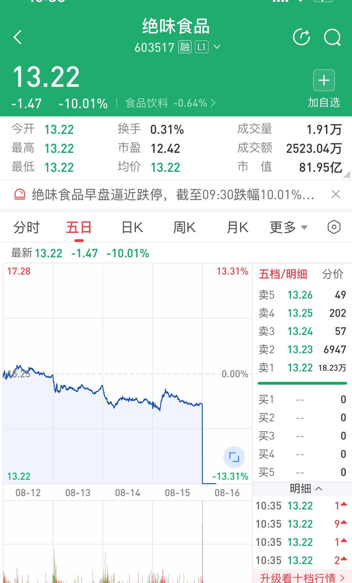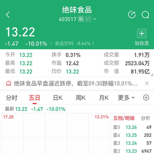 截至16日扬子晚报/紫牛新闻记者发稿,绝味食品每股报13.22元,当日跌停,年内下跌近50%,公司最新市值为81.95亿元。