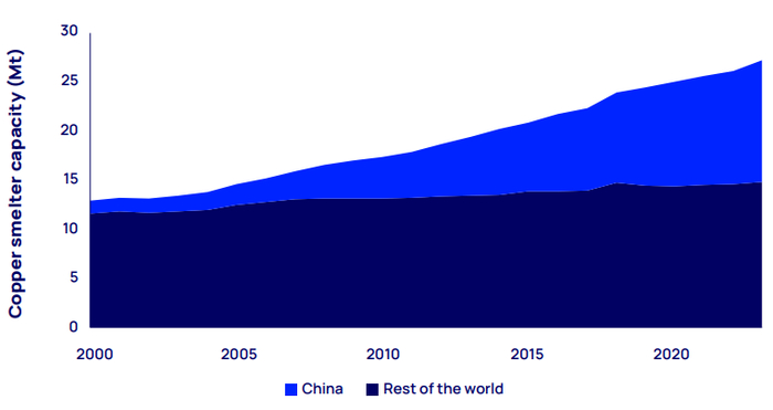 根据伍德麦肯齐的数据,自2000年以来,中国承担了全球75%的冶炼能力增长;自2019年以来,该国在全球铜和铜合金新增制造能力的占比约为80%,目前拥有全球一半的制造能力。