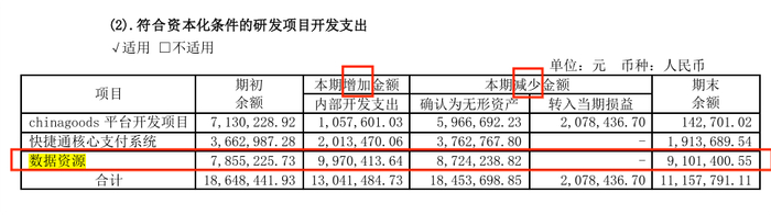 此外,南财数据团队观察到小商品城的数据资产入表链条十分清晰。在2023年年底的财务报表中,小商品城已在“开发支出”项目下的“数据资源”子项中列示了785.52万元数据资源。根据会计处理的相关准则,这785.52万元的数据资源,加上本期新增的开发支出997.04万元,扣除已确认为无形资产(尚未摊销)的数据资源872.42万元后,构成了本期符合资本化条件的研发项目开发支出,金额为910.14万元。