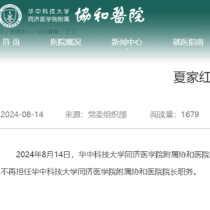 2024年8月14日,华中科技大学同济医学院附属协和医院召开干部职工大会,省委组织部宣布省委决定:夏家红同志任华中科技大学同济医学院附属协和医院院长;胡豫同志因年龄原因不再担任华中科技大学同济医学院附属协和医院院长职务。