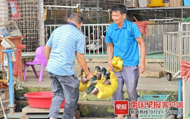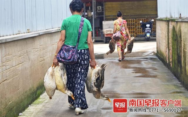 在南宁市官塘市场和建政菜市的活禽交易区,各种各样的鸭子也成为主角,商贩们吆喝、抓鸭、杀鸭……忙个不停。