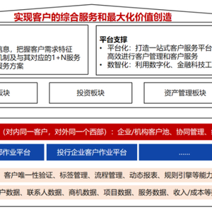 平台独创“N纵一横”产品架构。在“N纵”作业平台的建设上,实现了各业务板块客户数据的集中归集,提升各业务板块的客户运营管理水平。在“一横”运营管理平台的建设上,充分利用数字技术打破信息壁垒,实现公司层面全领域、多层级的企业和机构客户数据统一归集共享,沉淀公司企业和机构客户资产,指导经营分析,辅助运营决策。
