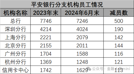 具体来看,平安银行各大分支机构都出现了不同程度的裁员。其中,总行减员最多,有500人;第一大分行深圳分行减员190人,信用卡中心减员113人。