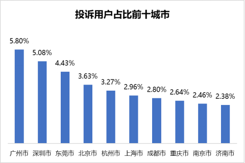 据统计,三大运营商相关投诉用户聚集城市排名前三的依次为广州市(5.80%)、深圳市(5.08%)和东莞市(4.43%)。