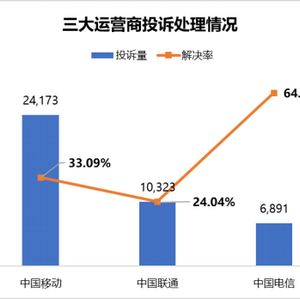 在投诉量方面,中国移动以24,173件投诉位居榜首,但解决率仅为33.09%。中国联通收到10,323件投诉,解决率为24.04%,而中国电信投诉量为6,891件,但相比之下,高于其它两个,达64.62%。