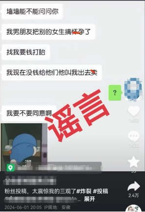 近日,合肥警方巡查发现,有网民在某短视频平台发布图文视频,内容为某学院学生向其投稿,投稿人声称“我男朋友把别的女生搞怀孕了,找我要钱打胎,我现在没钱给他们,他叫我出去卖,我要不要同意啊”,该视频引起网民热议,浏览量高达数十万,造成较大范围传播。