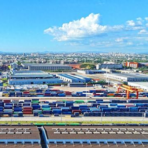 2024年7月6日,江西省赣州市南康区龙岭镇的赣州国际陆港货场,货运班列、集装箱运输车装卸繁忙,出口家具和进口原木货柜整齐排列。视觉中国 资料图
