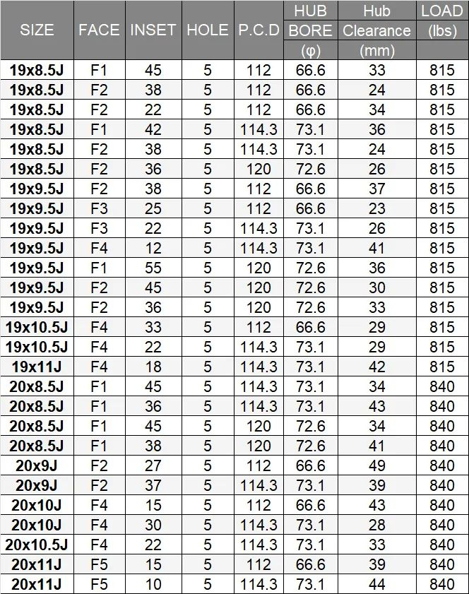 -19x8.5J:适合一些主流的小型欧洲车,如AUDI A3(8V)、A4(8E,8K)(不包括3.2FSI Quattro)、MINI CROSSOVER(F60)、VW GOLF(Ⅶ)(包括R)。