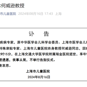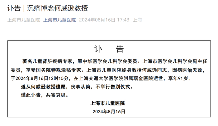8月16日,上海市儿童医院发布讣告称,著名儿童肾脏疾病专家,原中华医学会儿科学会委员、上海市医学会儿科学会副主任委员,享受国务院特殊津贴专家、上海市儿童医院终身教授何威逊因病医治无效,于2024年8月16日12时15分,在上海交通大学医学院附属瑞金医院逝世,享年91岁。