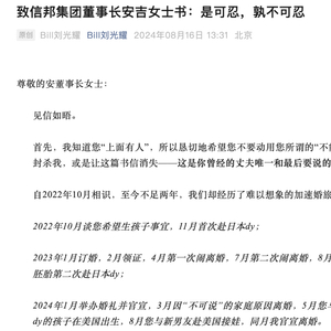8月16日,95后CEO、服饰品牌bosie(伯喜)创始人刘光耀在个人微信公众号发布《致信邦集团董事长安吉女士书:是可忍,孰不可忍》公开信,回应两人结婚、代孕、离婚及关系崩裂始末,并针对骗婚、形婚、债务等问题向前妻质疑。