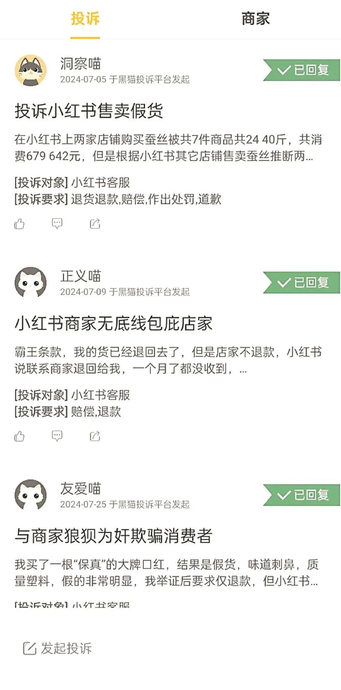 调查还发现,网络上存在大量小红书商家涉嫌出售假货的投诉,仅黑猫投诉平台上收录的相关投诉就超过2500条。