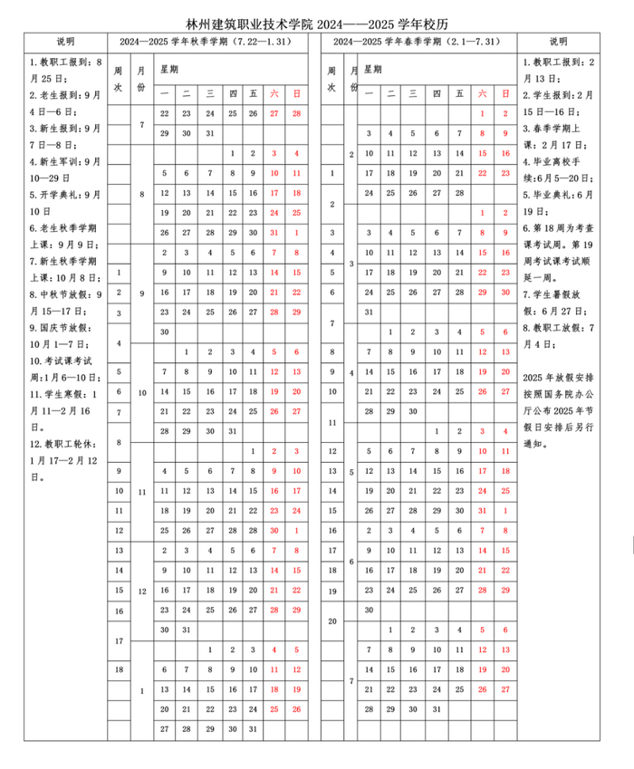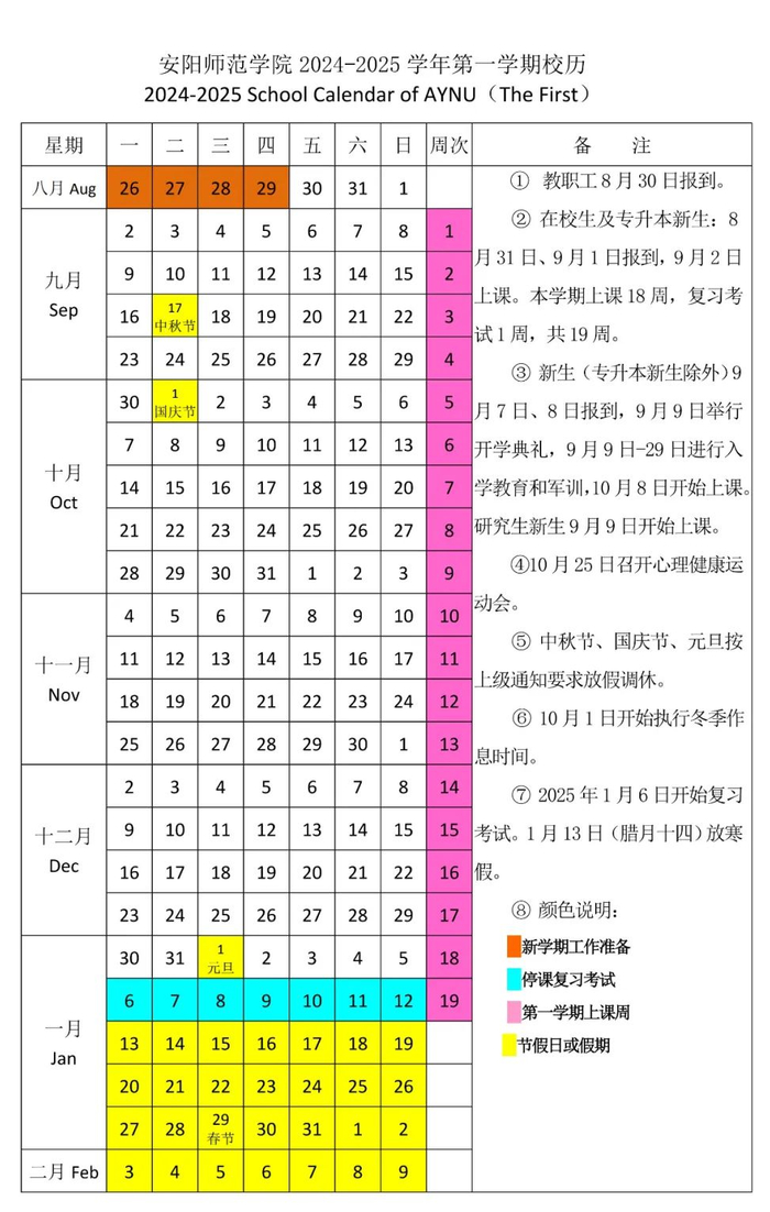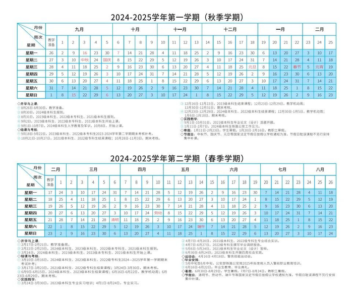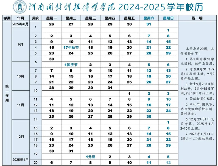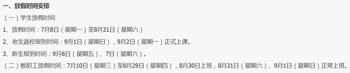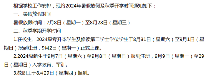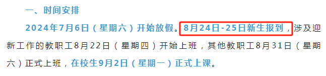 8月24日-25日新生报到,涉及迎新工作的教职工8月22日(星期四)开始上班,其他教职工8月31日(星期六)正式上班,在校生9月2日(星期一)正式上课。