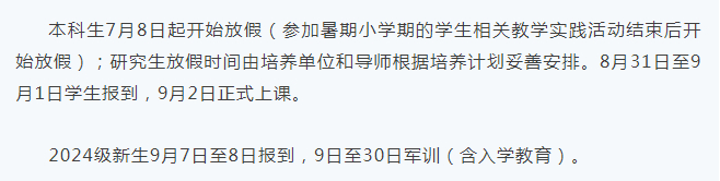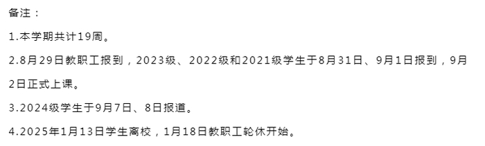 2024年8月31日-9月1日师生报到、注册,9月2日(星期一)上课。新生9月7日-8日报到。