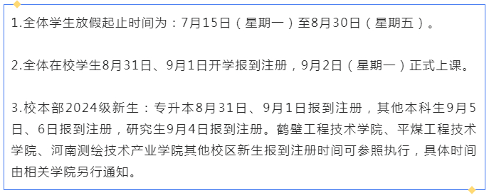 校本部2024级新生:专升本8月31日、9月1日报到注册,其他本科生9月5日、6日报到注册。鹤壁工程技术学院、平煤工程技术学院、河南测绘技术产业学院其他校区新生报到注册时间可参照执行,具体时间由相关学院另行通知。