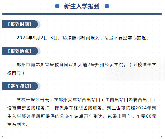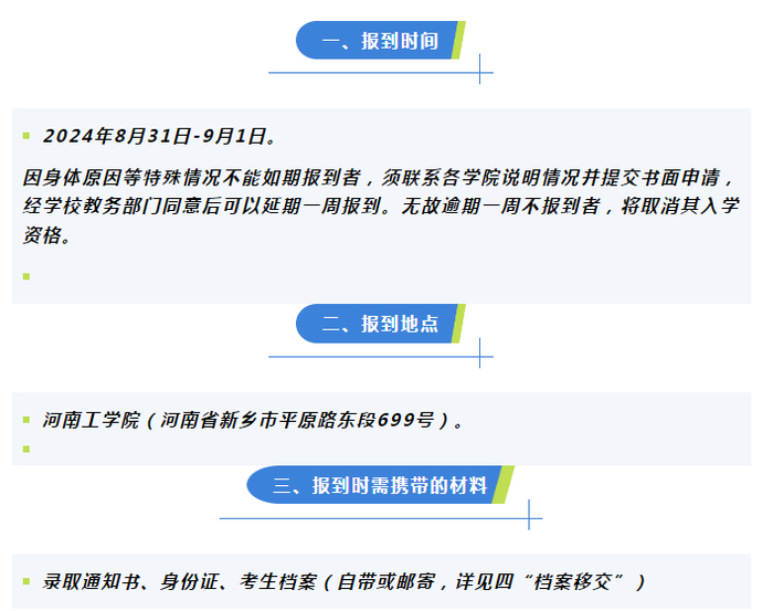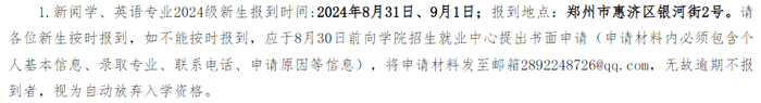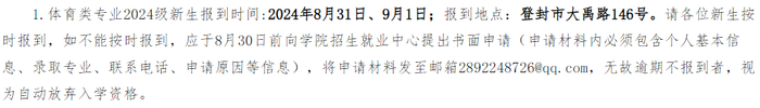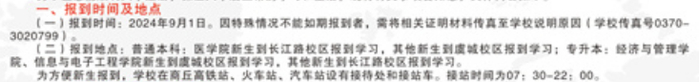 报到时间:2024年9月1日。因特殊情况不能如期报到者,需将相关证明材料传真至学校说明原因(学校传真号0370-3020799)。
