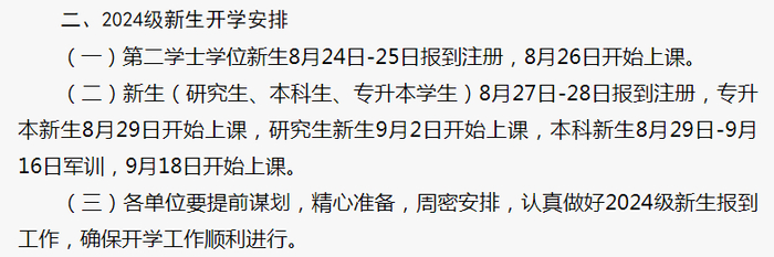 2024级本科新生9月12日报到,研究生新生9月13日报到。