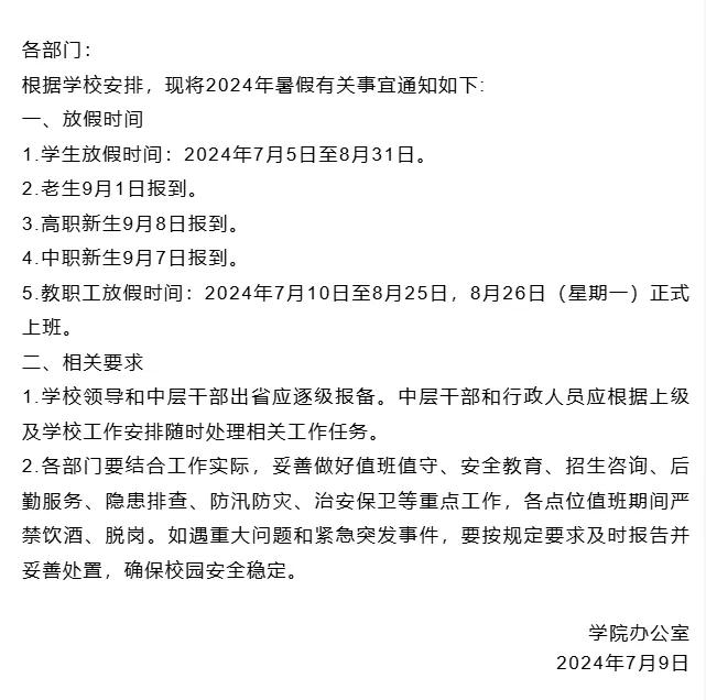 学生返校时间:9月6日至9月7日2023年级大专生及中专生报到,2024级大专新生及2024级中专新生9月8日至9日报到。