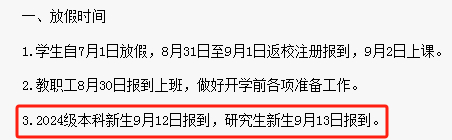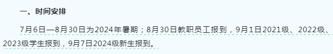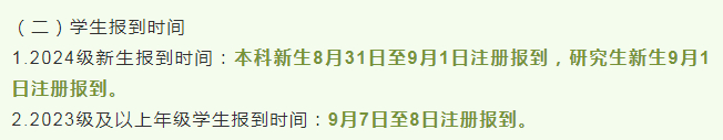 8月30日教职员工报到,9月1日2021级、2022级、2023级学生报到,9月7日2024级新生报到。