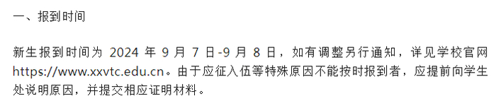 新生报到时间为2024年9月7日-9月8日,如有调整另行通知,详见学校官网 https://www.xxvtc.edu.cn。由于应征入伍等特殊原因不能按时报到者,应提前向学生处说明原因,并提交相应证明材料。