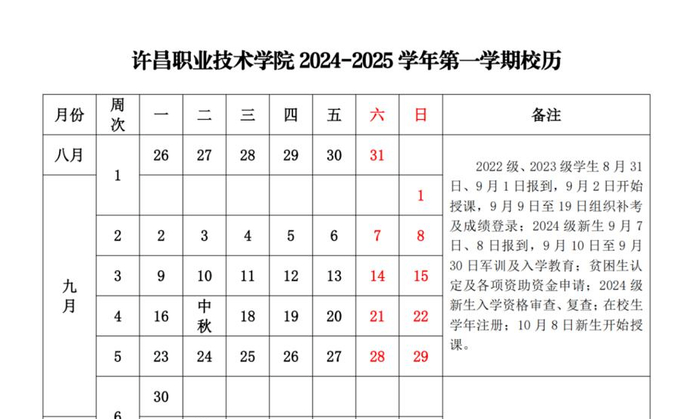 2024级新生9月7日、8日报到,9月10日至9月30日军训及入学教育;贫困生认定及各项资助资金申请;2024级新生入学资格审查、复查;在校生学年注册;10月8日新生开始授课。