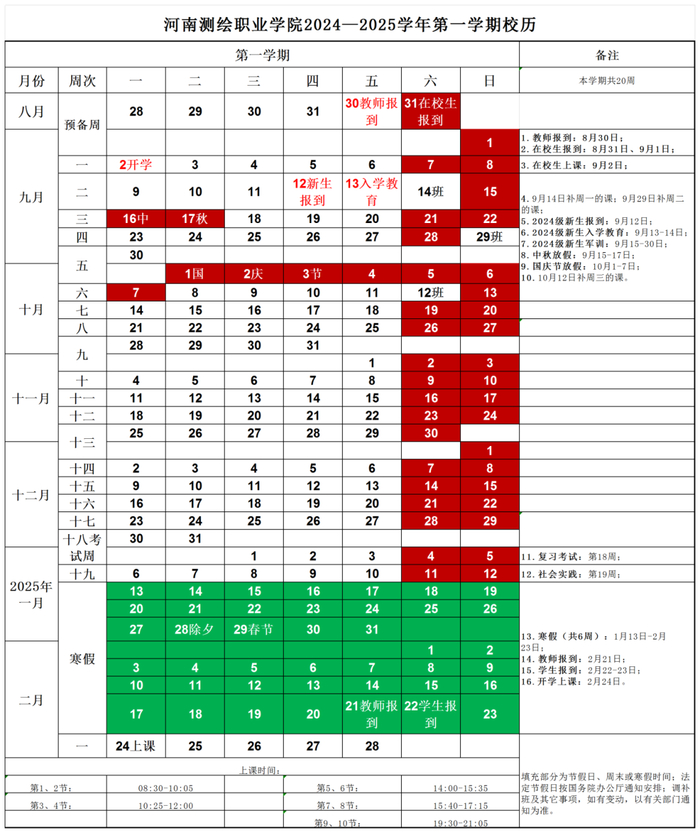 在校生及专升本新生:8月31日、9月1日报到,9月2日上课。本学期上课18周,复习考试1周,共19周。