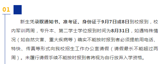 新生凭录取通知书、准考证、身份证于9月7日或8日到校报到,校内军训两周,专升本、第二学士学位报到时间为8月31日。
