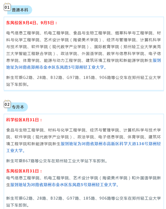 电气信息工程学院、机电工程学院、食品与生物工程学院、烟草科学与工程学院、材料与化学工程学院、艺术设计学院(陶瓷美术学院)、经济与管理学院、计算机科学与技术学院、软件学院(现代数字产业学院)、国际教育学院(郑州轻工业大学奥克兰大学智能工程联合学院)、政法学院、外国语学院、数学与信息科学学院、电子信息学院、体育学院、能源与动力工程学院、建筑环境工程学院和新能源学院新生报到地址为河南省郑州市金水区东风路5号郑州轻工业大学。
