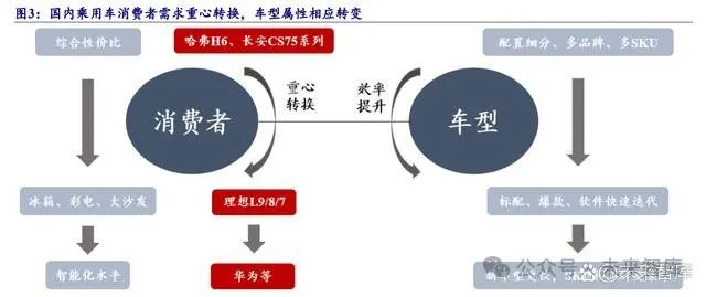 (1)轿车时代和 SUV 时代,消费者更注重汽车的实用主义或综合性价比,彼时的 车型细分配置更多,车企通过推出不同的子品牌定位不同市场,推出众多细分配置 来俘获更多的消费者。 (2)电动化时代,随着电动车市场的快速发展,消费者对电动车的期望逐渐提高, 关注点从最初的续航里程和充电便利性逐步转向驾乘体验。以理想 L 系列为例,家 庭消费者除了关注续航里程和充电便利性外,也更加注重车内的驾乘体验,空间、 冰箱、彩电、大沙发等配置成为消费者关注的焦点。理想汽车将曾经的高端选配变 为标配,明显提升了整体的驾乘舒适度。同时,市场上涌现出更多的爆款车型,软 硬件迭代速度也明显加快。 (3)在智能化时代,以华为智选爆款车问界新 M7 为例,消费者对汽车的智能化 水平关注度提高,智驾系统提升驾驶安全性和便捷性的同时,也为消费者提供全新 的驾驶体验。