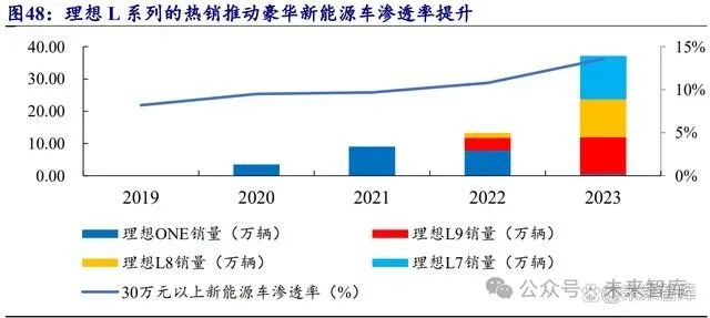 理想 L9:顶配豪华车,提升品牌调性。40 万元以上价格带的新能源乘用车渗透率 持续提升+供给端车型较少,品牌处于相对垄断地位,替代空间大。L9 解决前期用 户槽点的同时,空间更大、智能化程度更高、提升客户驾乘体验和安全性、续航更 久,理想打造 40 万元以上车型,引领品牌向上。 理想 L8、L7、L6:升级版 ONE,下沉版 L9,每款推出多个版本,覆盖更多客户 群体。理想 L8 推出 Max/Pro/Air 版本,在保留消费者核心诉求的同时,依次减配智 能驾驶和智能座舱功能,售价低至 33.98 万元;理想 L7 打造 5 座 SUV,聚焦三口 之家市场,也推出 Max/Pro/Air 版本,售价低至 31.98 万元,推出皇后座、露营大床等新功能,价格下探的同时提升驾乘人员的体验;理想 L6 价格下探至 24.98 万元, 车长控制在 5 米以内,推出 Max/Pro 版本,取消空悬,电池采用磷酸铁锂电池,首 次标配有电动遮阳帘的全景大天幕,车机芯片升级为高通骁龙 8295,性价比高。