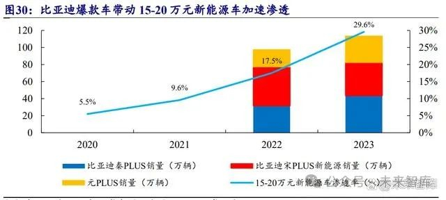 比亚迪驱动 15-20 万元新能源车快速抢占燃油车市场。比亚迪于2022 年 1 月强势推 出元 PLUS、宋 PLUS 新能源、秦 PLUS 比亚迪,打造爆款系列矩阵,这三款车型 的亮眼销量带动 15-20 万元新能源车强势抢占燃油车市场,2023 年 15-20 万元新能 源车渗透率接近 30%。