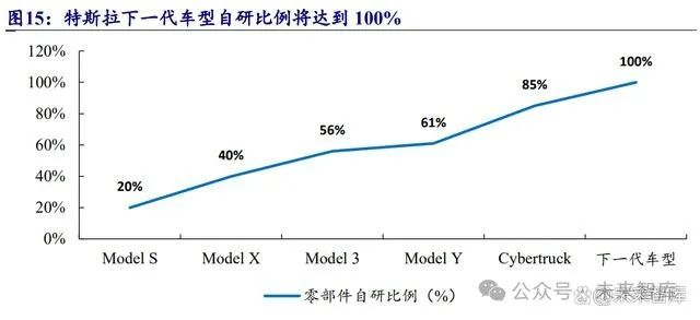 特斯拉最早推出定位高端化的纯电动跑车 Roadster,外观为自主化创新设计,售价 为 135~200 万元,百米加速仅需 2.1 秒,当前已不在售。第一批进驻中国的旗舰版 高端车型 Model X/S 是国人心目中的特斯拉代表性车型。纯电动中型 SUV--Model Y 为特斯拉旗下最热销车型,具有续航长、充电快、空间大等优点。纯电动轿车 Model3 价格最便宜,其出色动力和操控性适合长期独自驾驶的年轻消费者。此外, 纯电动皮卡 Cybertruck 已于 2023 年规模化量产。同时,特斯拉产品零部件自研比 例持续上升,特斯拉下一代车型自研比例将达到 100%。