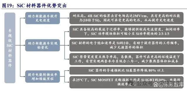 特斯拉率先采用 SiC 材料器件,引领整车发展。2018 年,特斯拉在 Model 3 上首次 采用意法半导体的 650V SiC MOSFET 逆变器,相较 Model X 等采用 IGBT 的车型 实现了 5%~8%的效率提升,并在此后的几款车型中均采用 SiC 技术。碳化硅元器 件核心的优势突出,(1)能量损耗低,导通电阻可至少降低至原来的 1/100,开关 频率更快,电控系统效率可提高至 99.5%;(2)耐高压/耐高温,更易被击穿,可 支持 800V 甚至 1200V 整车平台,带来更强的电气化功能支持以及更优的能耗;轻 量化,尺寸可大幅减小至原来的 1/10,因此功率模块体积更小、更紧凑;(3)碳化 硅的应用能够非常直接地提升新能源汽车的续驶里程。假设纯电动汽车逆变器的功 率模块全部采用碳化硅元器件,整车续驶里程可增加 5-10%;(4)碳化硅的应用是 搭建 800V 及以上高压平台的前提条件,从而实现对超级快充功能的支持。同时, 2024 年北京车展中展出的配备碳化硅的车型超 70 款,比如小米 SU7、智己 L6、华 为智界 S7、问界新 M5、奇瑞星纪元 ET 等车型。